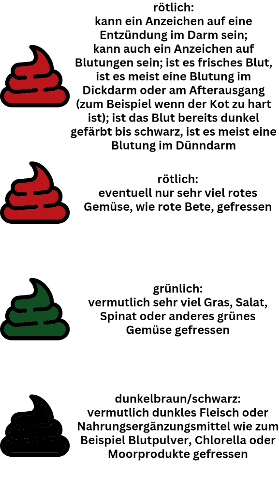 Wenn du ein Fertigfutter fütterst, welches Farbstoffe enthält, können diese den Kot auch verfärben.